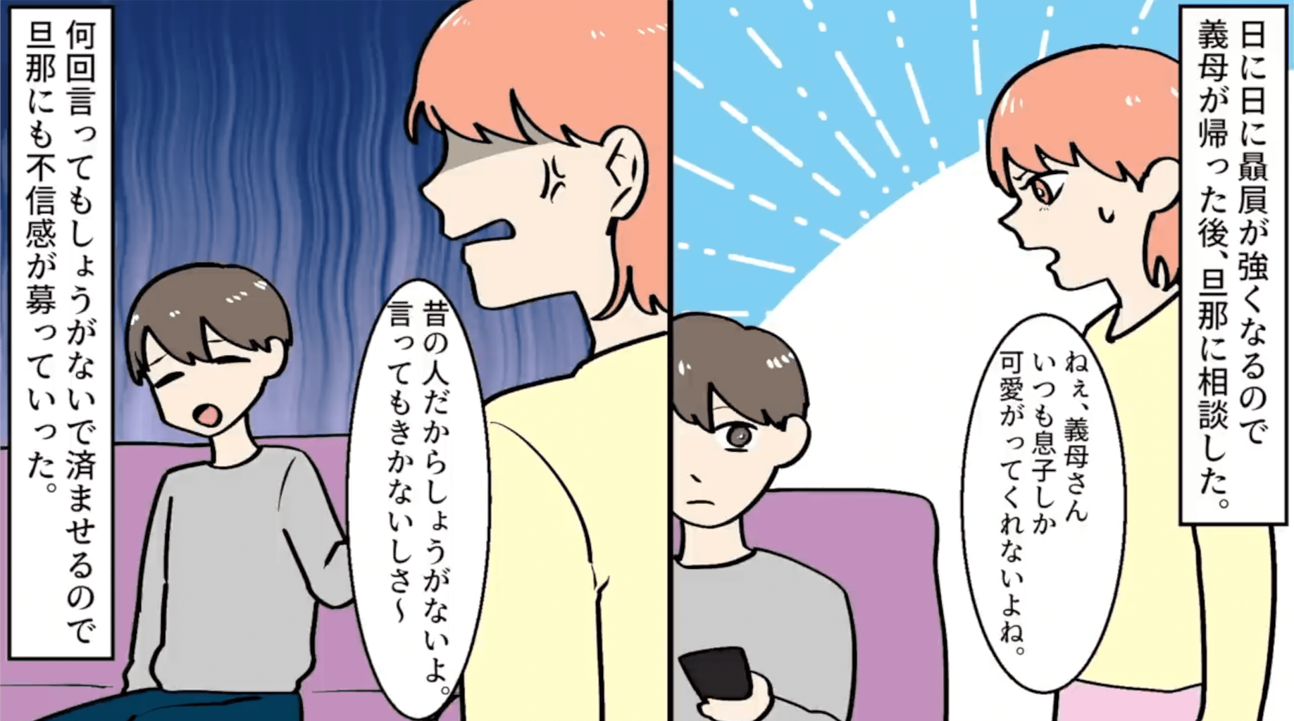 息子しか可愛がらない義母の話 #1 2022年10月31日 13:00 私は半年前に双子の男女を出産した。初めての慣れない育児にタジタジの私。初孫に浮かれた義母がほぼ毎日のように訪問してくる。それだけだとまだ可愛いものなのだが・・・息子だけを長男、跡取りと可愛がり娘はまるで空気のような扱い。日に日に贔屓が酷くなっていくので旦那に相談してみると・・・次回へ続く・・・ 完結済みのお話はこちらです 「鬱陶しい身内の話」カテゴリの最新記事 タグ :#鬱陶しい身内の話#義母#長男教#双子#出産#跡取り#贔屓 < 前の記事次の記事 > コメント コメント一覧 (1) 1. 名無しさん 2022年10月31日 13:54 男女の一卵性双生児は世界でまだ2例しかない超レアケース(1つの卵子が分裂して2人になるけど、遺伝子情報は同じ) 2卵生双生児の場合男女になる事がある(2人とも同性になる事もあり。これは卵子2個が同時にそれぞれ受精したから) この漫画の男女の一卵性双生児は1つの卵子に2個の精子が同時に受精という稀過ぎるケース この場合準一卵性双生児という事らしい 豆知識でした 0 モモコ がしました コメントフォーム 名前 コメント 記事の評価 リセット リセット 顔 星 情報を記憶 コメントを投稿する