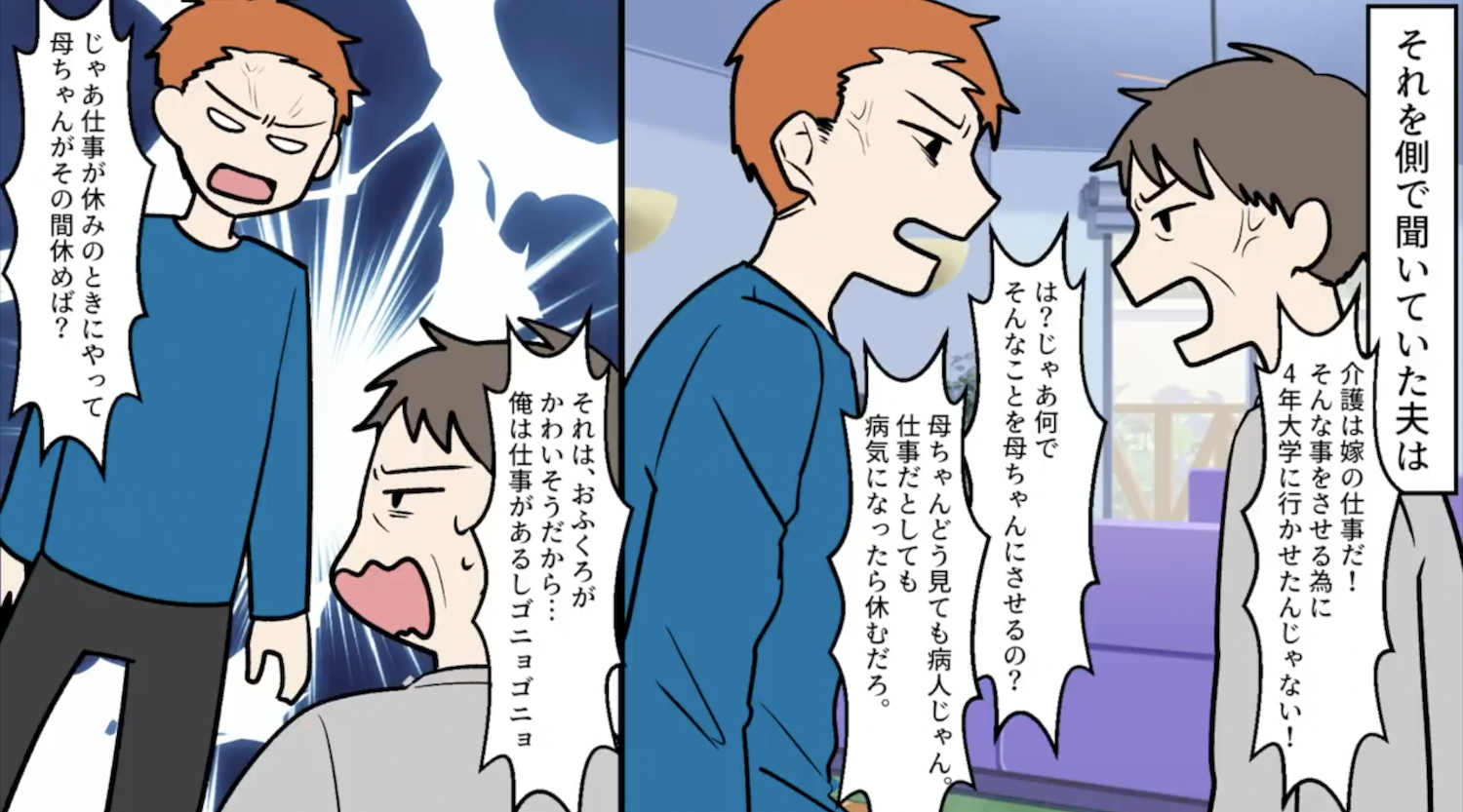一切介護を手伝わないのに「お前の家のことより俺の親を優先しろ」と言ってくる夫【4】 2022年11月01日 14:00 夫が自分の立場を勘違いして、威張り散らすほど義母の態度はどんどんと優しくなった。介護が始まってから私の体重はこの1年で12キロの激痩せ。人生で一番痩せているであろう時期に遠く離れて暮らしていた息子が久々に帰ってくると・・・このお話を始めから読む↓前回のお話はこちら↓ 私には威張ったり怒鳴ったり出来る夫だが、息子には怖くて何も言えない情けない姿を見たら急に力が抜けてしまった・・・次回へ続く・・・ 完結済みのお話はこちらです 「スカッとする話」カテゴリの最新記事 タグ :#スカッとする話#夫婦問題#離婚#介護#義実家#義母 < 前の記事次の記事 > コメント コメント一覧 (1) 1. ななしのななこ 2022年11月01日 16:00 義母も罪悪感が湧いてきたのか 0 モモコ がしました コメントフォーム 名前 コメント 記事の評価 リセット リセット 顔 星 情報を記憶 コメントを投稿する