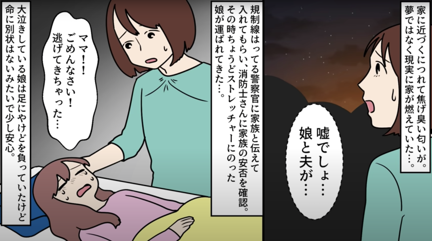 友人の結婚式に行っている間に家が火事になっていた【3】 2022年11月02日 15:00 家に近づくと焦げ臭い匂いが。夢でも何でもなく、現実に家が燃えていた…。このお話を始めから読む↓ 前回のお話はこちら↓ ストレッチャーに乗った娘が運ばれてきたものの夫はまだ見つかっていない。何もできなくて呆然と家を眺めていると夫から着信が…。『ごめん!充電してて気づかなくってさ。どうしたの?』▶︎読者登録して最新話を最速で読む!▶︎Twitterをフォローして更新を最速で通知!次回へ続く・・・ 完結済みのお話はこちらです 「衝撃的な体験」カテゴリの最新記事 タグ :#衝撃的な体験#スカッとする話#漫画#マンガ#浮気#不倫#火事 < 前の記事次の記事 > コメント コメントフォーム 名前 コメント 記事の評価 リセット リセット 顔 星 情報を記憶 コメントを投稿する