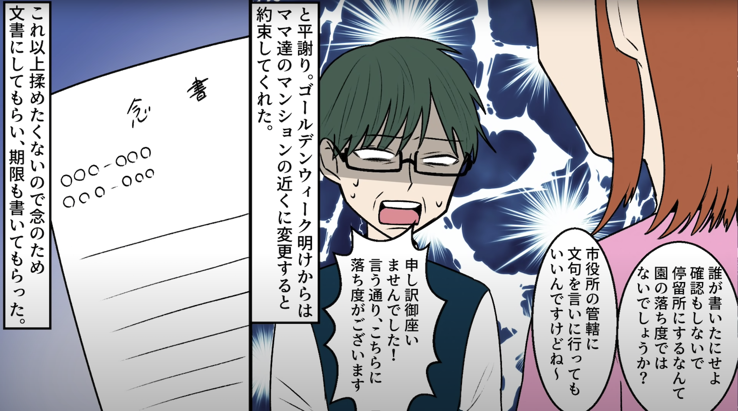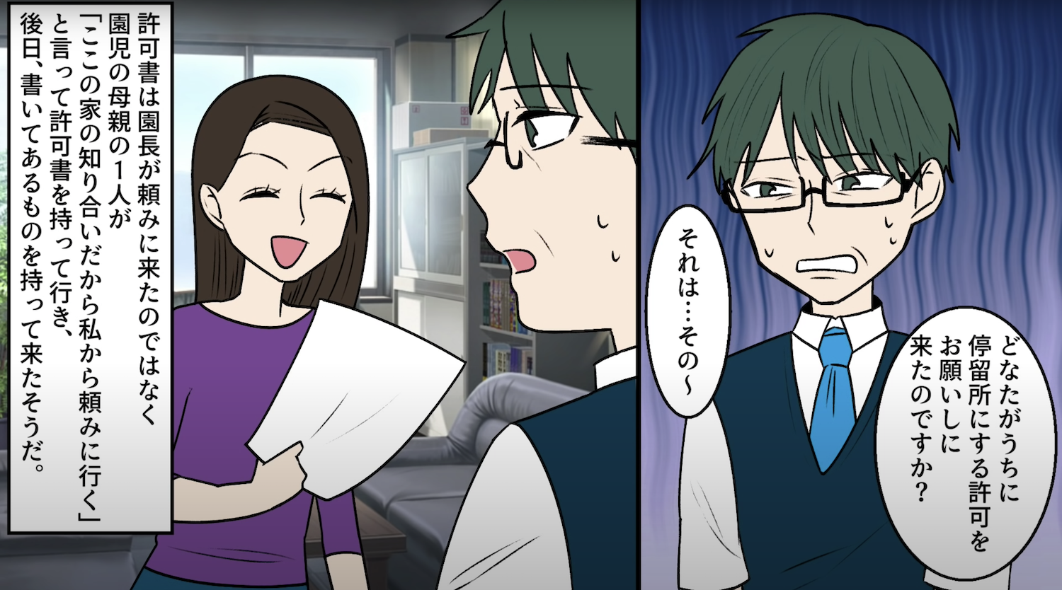 実家を勝手に幼稚園バスの停留所された話【3】 2022年11月07日 21:00 証拠のため、妹に動画の撮影をお願いして注意しに行くと...このお話を始めから読む↓ 前回のお話はこちら↓なんと園児の母親の一人が許可証に勝手にハンコを押して幼稚園に提出していた...。▶︎読者登録して最新話を最速で読む!▶︎Twitterをフォローして更新を最速で通知!次回へ続く・・・ 完結済みのお話はこちらです 「神経わからん話」カテゴリの最新記事 タグ :#スカッとする話#神経わからん話#ママ友#漫画#マンガ#幼稚園#無断駐車 < 前の記事次の記事 > コメント コメントフォーム 名前 コメント 記事の評価 リセット リセット 顔 星 情報を記憶 コメントを投稿する
