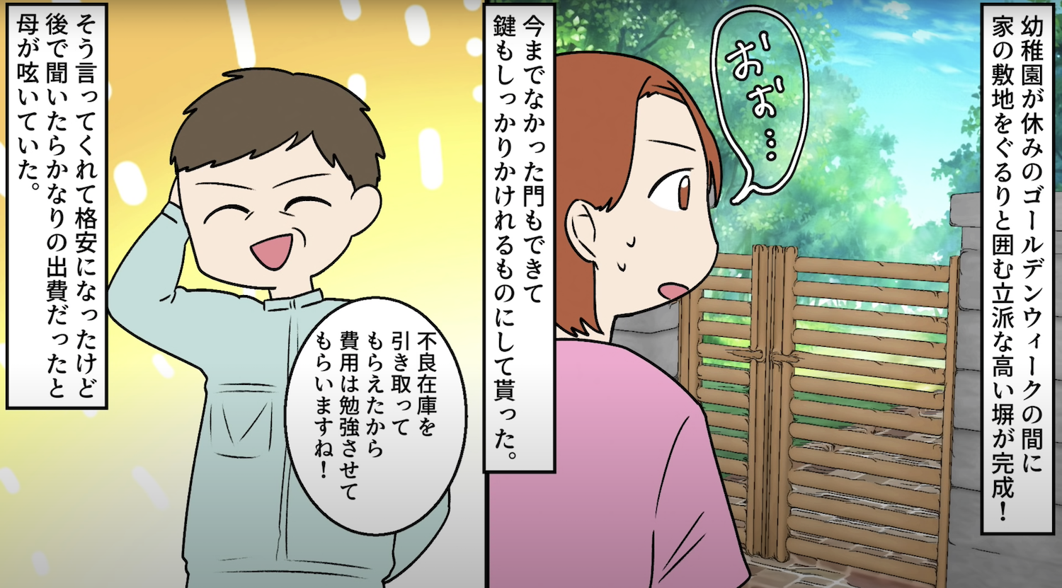 実家を勝手に幼稚園バスの停留所された話【4】 2022年11月08日 07:00 幼稚園の園長を問い詰めたその足で知り合いの工務店へ行き、家の周りに柵を立ててもらうことに...。このお話を始めから読む↓前回のお話はこちら↓ゴールデンウィークが明けて2日後、ママ達と子供たちがぞろぞろときていつも通り大騒ぎ。幼稚園バスがきて子供たちが乗り、母と妹とやれやれと思っている矢先、玄関チャイムが鳴った...。▶︎読者登録して最新話を最速で読む!▶︎Twitterをフォローして更新を最速で通知!次回へ続く・・・ 完結済みのお話はこちらです 「神経わからん話」カテゴリの最新記事 タグ :#スカッとする話#神経わからん話#ママ友#漫画#マンガ#幼稚園#無断駐車 < 前の記事次の記事 > コメント コメントフォーム 名前 コメント 記事の評価 リセット リセット 顔 星 情報を記憶 コメントを投稿する