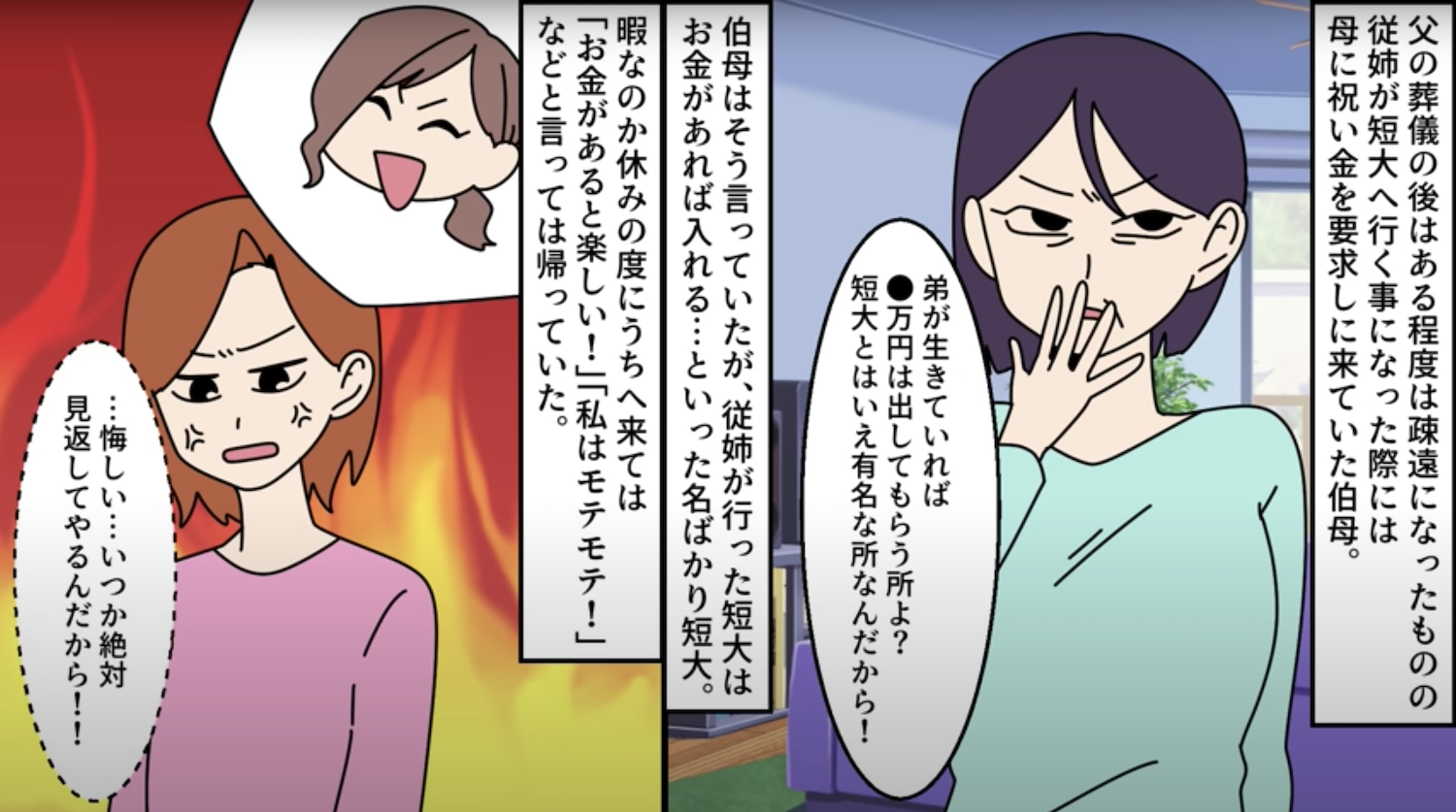 葬儀以降は従姉が短大に行く事になった際には母にお金をせびりにきていた。