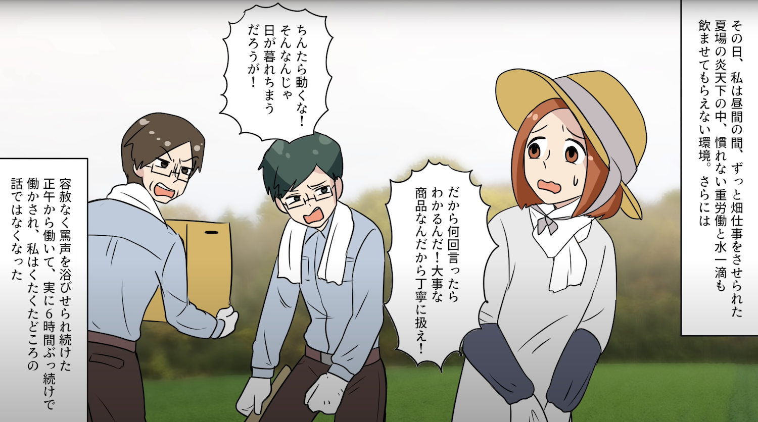 仕事中の水分補給も許されず、ご飯も少量しか与えられず栄養失調気味に。